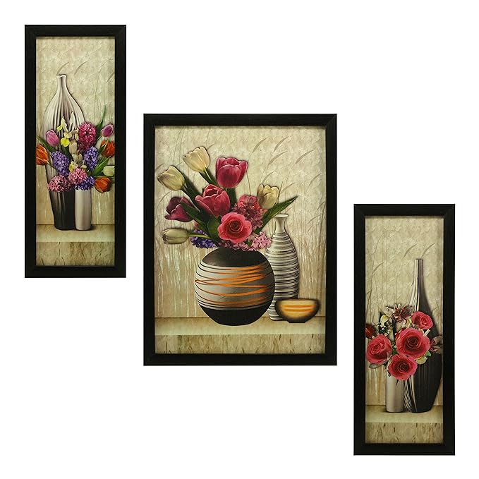 3 Pc Set of Floral Paintings (1056) Without Glass 5.2 X 12.5, 9.5 X 12.5, 5.2 X 12.5 Inch-Multicolour
