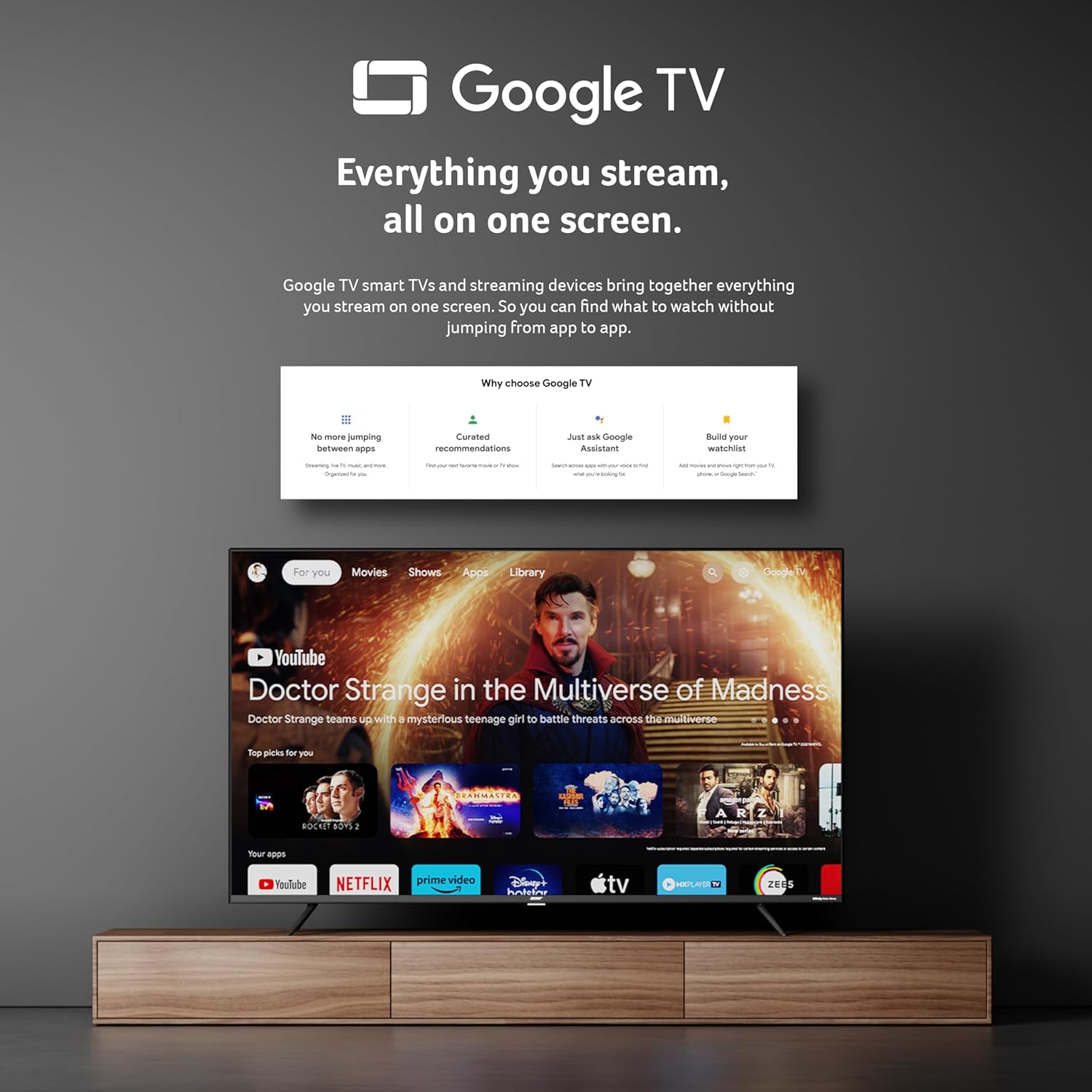 - Smart TV Features: Google TV | Content Recommendations | Dual Band WiFi | Bluetooth 5.2 | Casting option- Googlecast, Fastcast, Meeting mode | 3.0GB RAM | 32GB Storage | Watchlist | Personal Profile | Kids Profile | Google Assistant | Voice enabled Smart Remote | Hotkeys for Quick Access - Netflix, Prime Video, YouTube, Disney+Hotstar | Quad Core Processor | Screen Saver