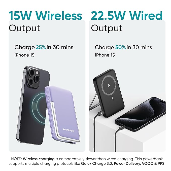 Ambrane 10000mAh MagSafe Powerbank with Stand 22.5W Wired & 15W Wireless Fast Charging Dual Input (Type-C & Lightning) | Triple Output | for iPhone 16/15/14/13/12 & Android Devices (PB11, Purple)