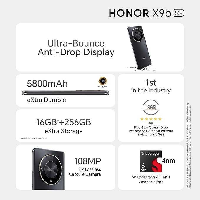- 5800mAh Upto 3-Day Battery - The HONOR X9b boasts a high-energy-density 5800mAh DXOMARK Gold Li-Po battery, showcasing its durability with over 80% battery health retention after 3 years and 1000 charging cycles.