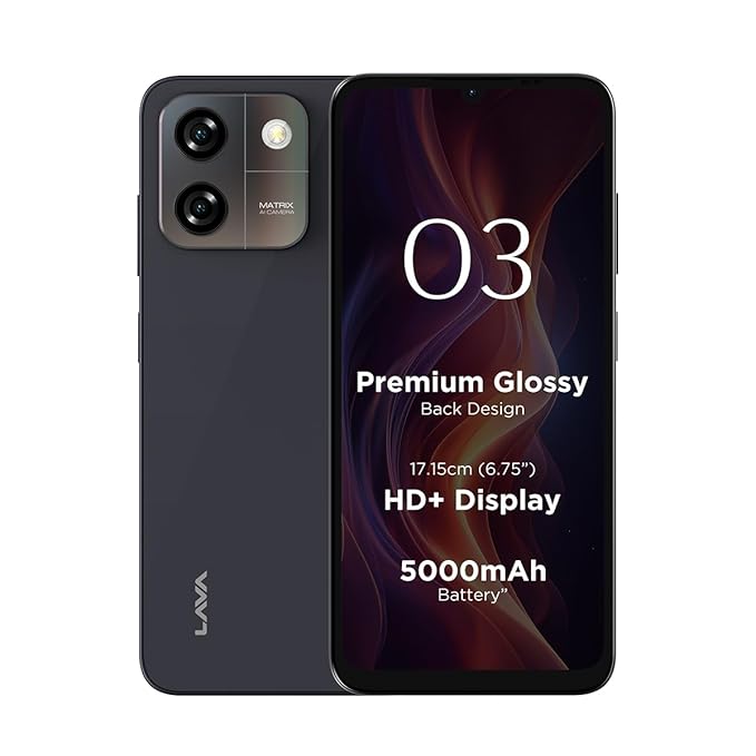 Lava O3 (Glossy Black, 4 GB RAM, 64 GB Storage) | Biggest 6.75" HD+ Display | 13MP AI Dual Rear Camera | 5000 mAh Battery | Secure Face Unlock | Fingerprint Reader | Charger & Phone-Cover in Box