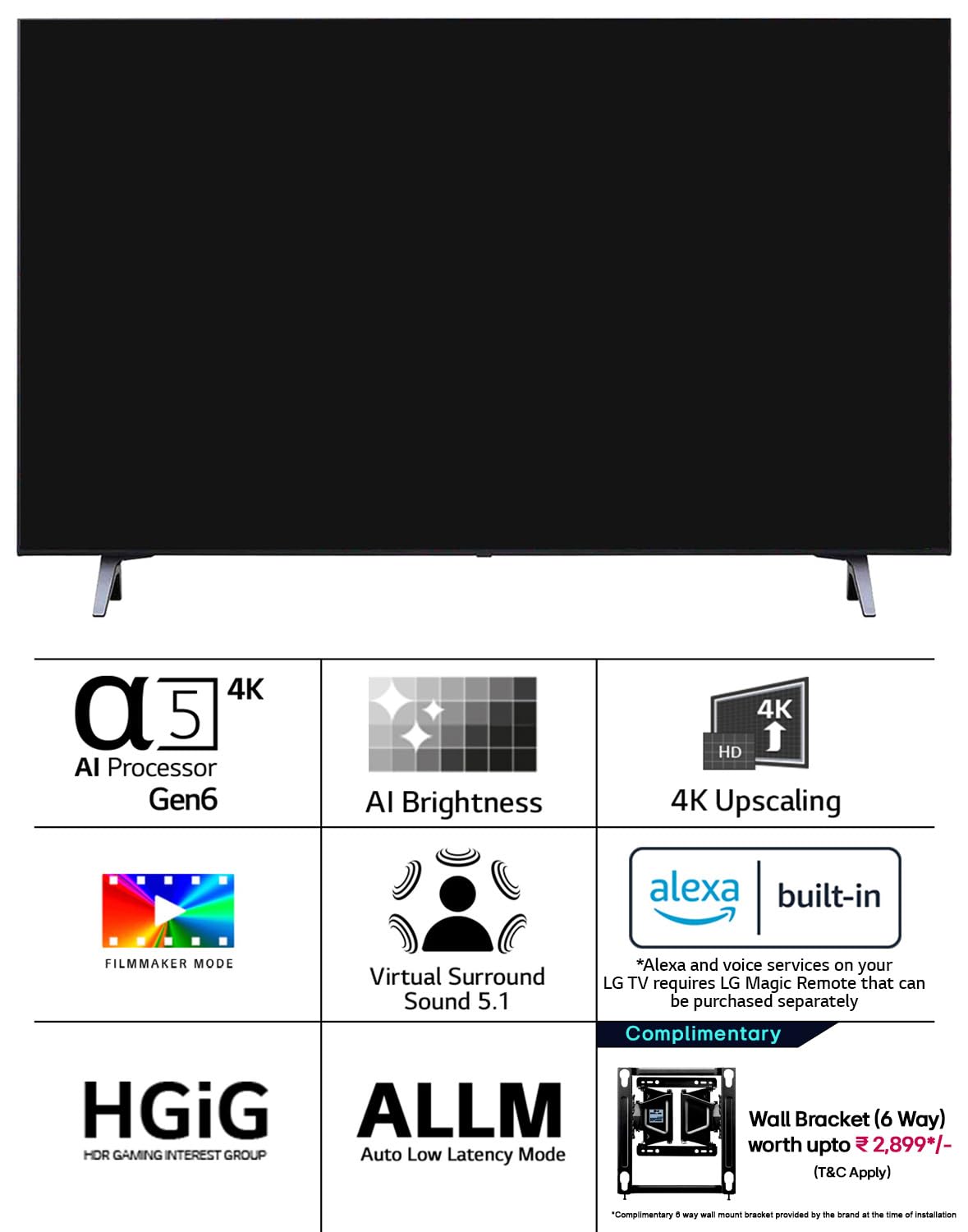 | Special Feature | WebOS 23 with User Profiles | Filmmaker Mode, HDR 10 & HLG | Game Optimizer, ALLM, HGIG Mode | Unlimited OTT Apps | AI Brightness Control, 4K Upscaling & AI Sound (Virtual Surround 5.1 up-mix)WebOS 23 with User Profiles | Filmmaker Mode, HDR 10 & HLG | Game Optimizer, ALLM, HGIG Mode | Unlimited OTT Apps | AI Brightness Control, 4K… See more |