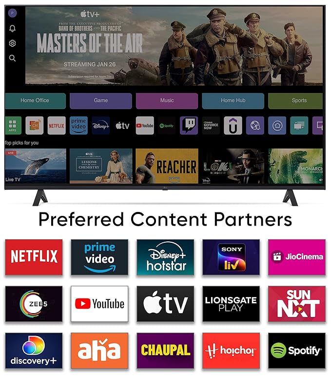 - Smart TV Features: WebOS Smart TV | AI ThinQ | Apple Airplay 2 & Homekit | Game Optimizer| Filmmaker Mode | α5 AI Processor 4K Gen6 | HDR 10 |1.5 GB RAM + 8 GB Storage | Unlimited OTT App Support: Netflix, Prime Video, Disney+ Hotstar, Apple TV, Jio Cinema, SonyLIV, Discovery+, Zee5, Voot, MxPlayer, Google Play Movies & TV, YuppTV, Youtube