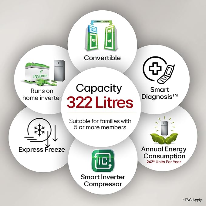 - Capacity 322 L: Suitable for families with 5 or more members I freezer capacity: 81 L, fresh food capacity: 241 L