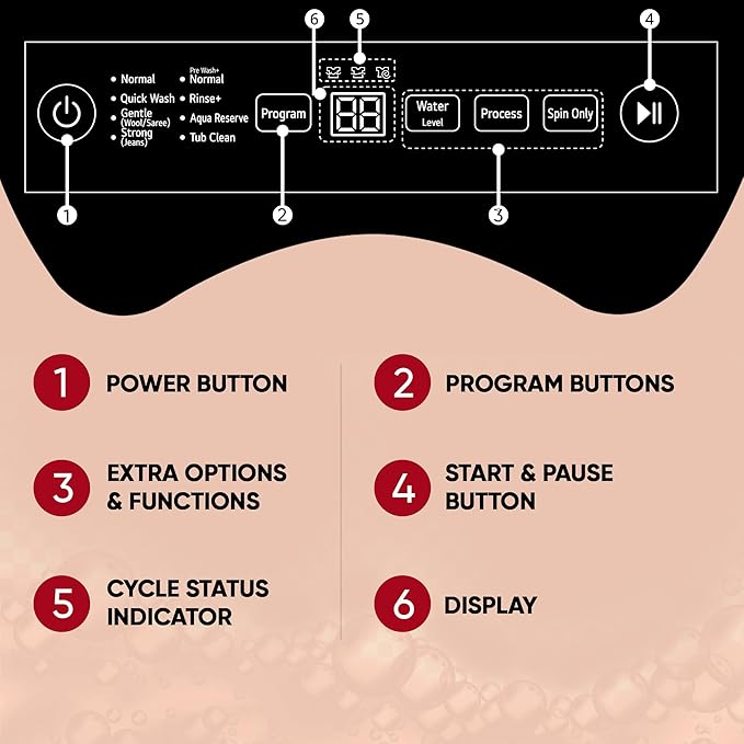- Wash Programs: 08 No. of Programs – Normal: built-in sensor detects the weight of the clothes, calculating wash, rinse and, spin settings accordingly | Quick Wash : Use this programme to wash lightly soiled clothes for a short time | Gentle(Wool/Saree): this programme to wash delicate fabrics such as lingerie and woolens | Strong: this programme for heavily soiled durable garments such as overalls, jeans | Pre-wash+Normal: this programme to pretreat immediate stain without handwash | Rinse+: This program will run same as Normal course with one extra rinse for all water levels | Aqua Reserve | Tub Clean: This is a special function to clean inside the drum of your appliance