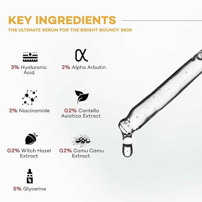 - Ultimate Glowing Skin Serum: Our serum is a powerhouse blend featuring 2% Alpha Arbutin Serum, 3% Hyaluronic Acid Serum, 2% Niacinamide Serum, and enriched with extracts like Centella Asiatica, Witch Hazel, Camu Camu, and Kakadu Plum.