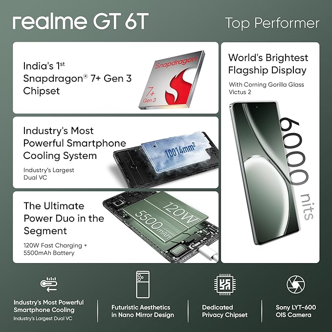 realme GT 6T 5G (Razor Green,8GB RAM+256GB Storage) | India's 1st 7+ Gen 3 Flagship Chipset | 1.5M + AnTuTu Score | 5500mAh+120W | The World's Brightest Flagship Display