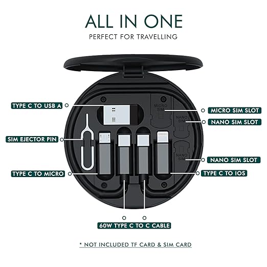 - 【Box Contains】: 1x Type C to Type C Cable, 1x Type C to USB A Adapter/Converter, 1x Type C to Lightening Converter,1x Type C to Micro USB Converter, 1x Sim Ejector Pin, Round Case can also be used as mobile stand/holder, It also has 2 Storage Space for Nano Sim Card & 1 Storage Space for Micro Sim Card & 6 Months Warranty. Please Note : (SIM card is not included).