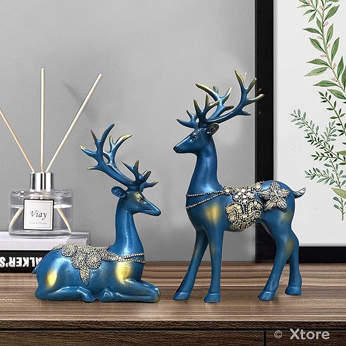 Xtore Creative Resin Golden Reindeer Sculptures | Beautiful Home Decor | Lifts up Energy of Your Room - (Pack of 2, Blue)